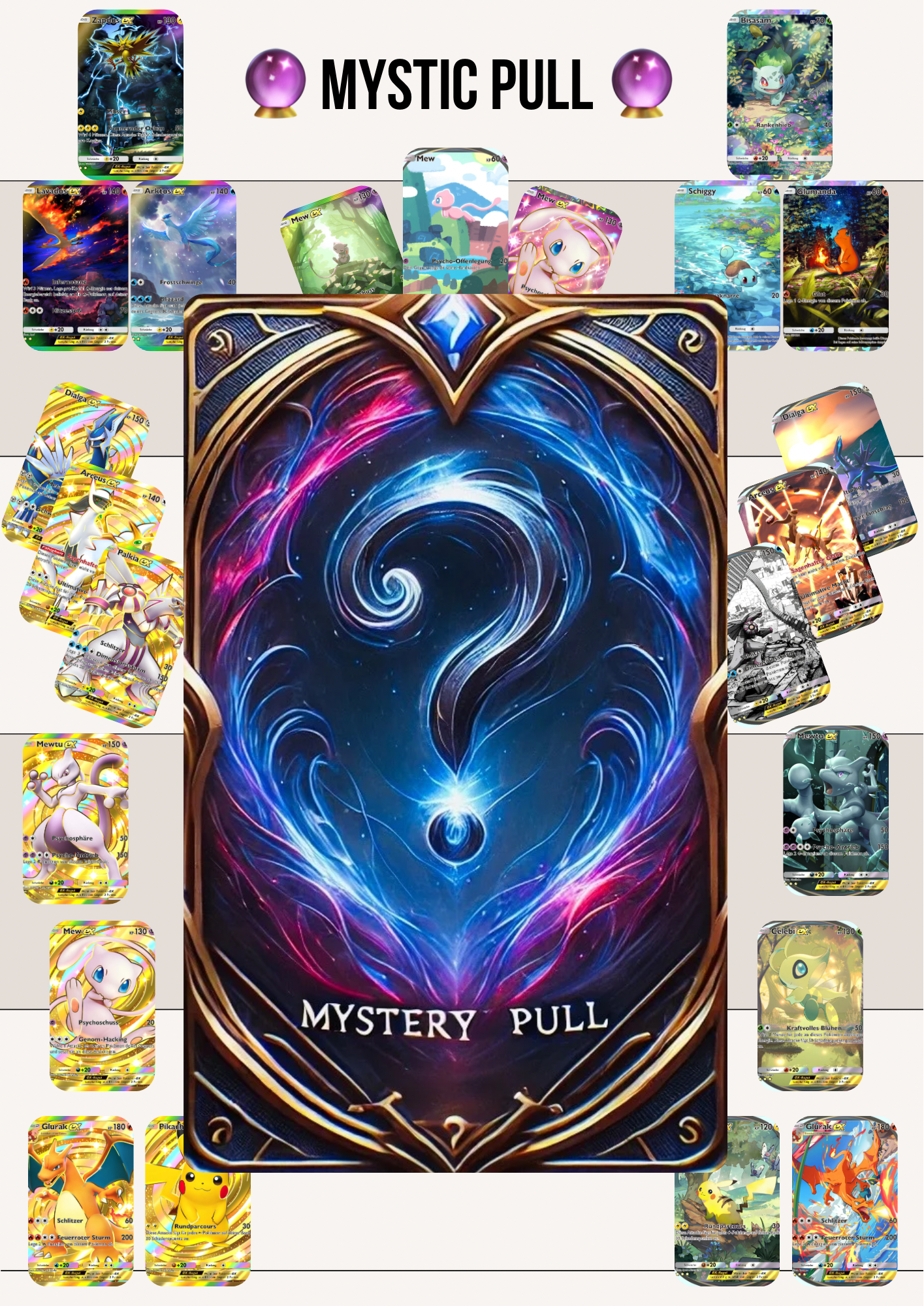 Du liebst Überraschungen? Dann ist Mystic Pull genau das Richtige für dich! Hier erhältst du zufällige Karten aus allen Packs, jedoch ohne doppelte Karten und immer mit hoher Seltenheit.